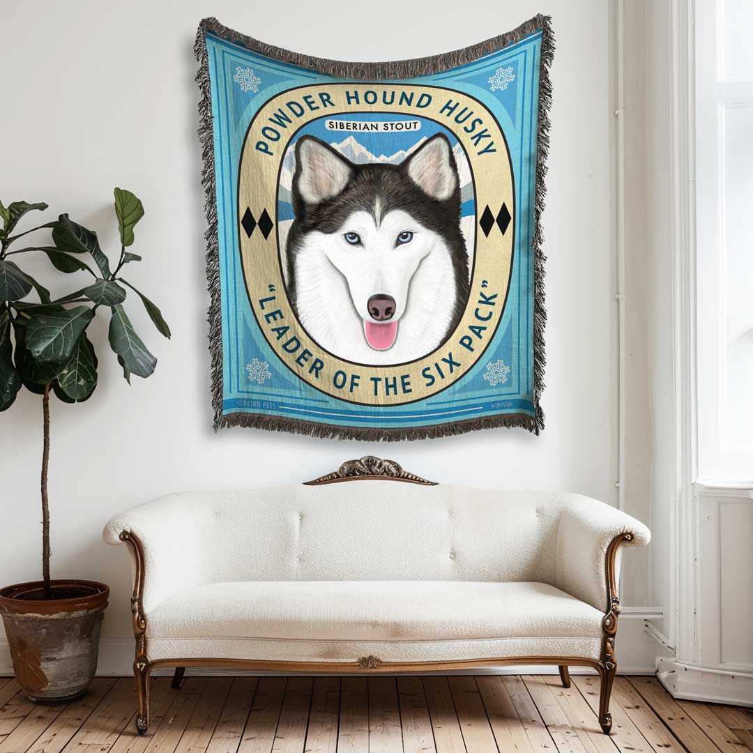 Check out this unique Siberian Husky keepsake – our Heirloom Artwork Woven Blanket featuring the artwork of Retro Pets artist Krista Brooks (that's me!). The wordplay on this fantastic blanket says it all. What a special gift this will make for yourself or the Siberian Husky lover in your life.