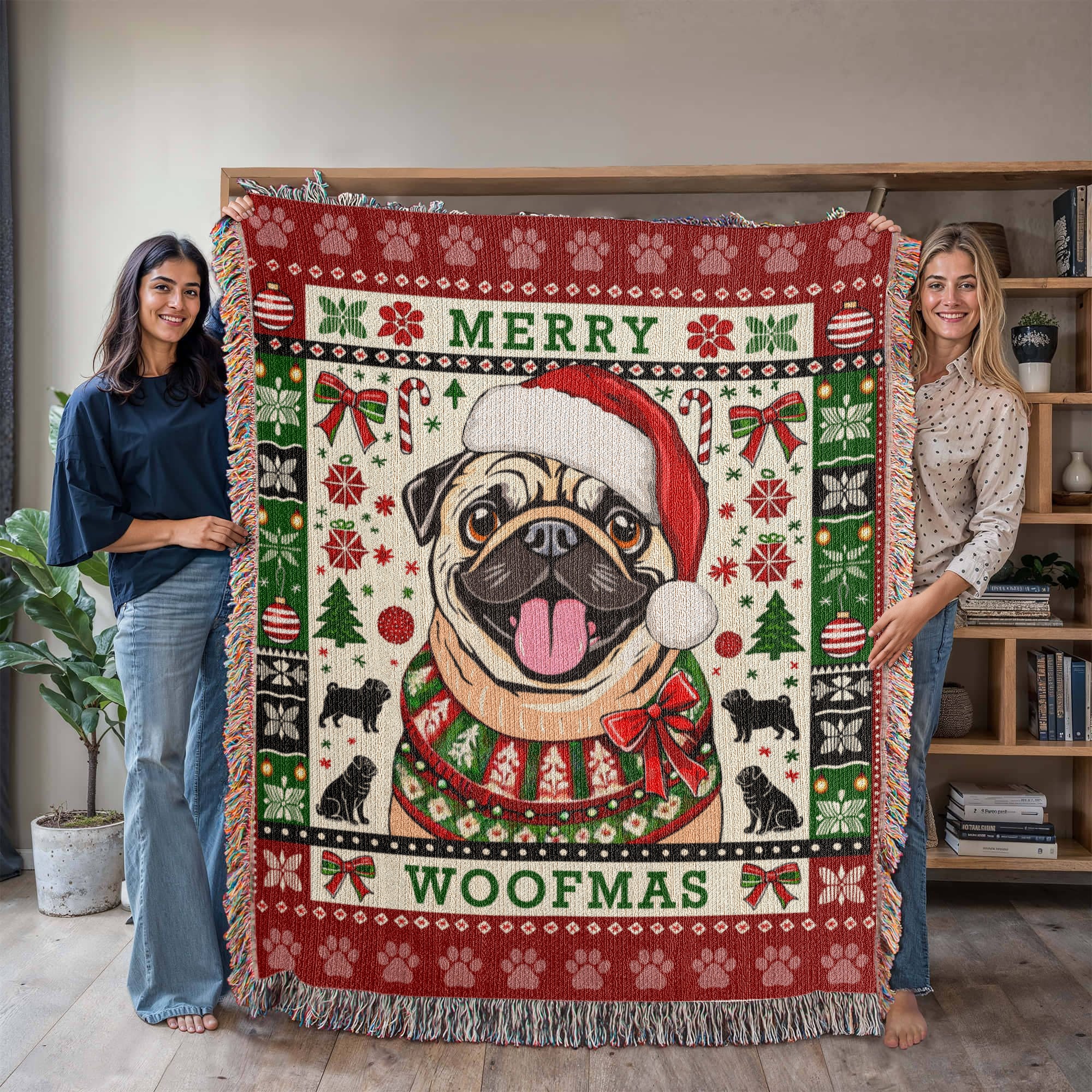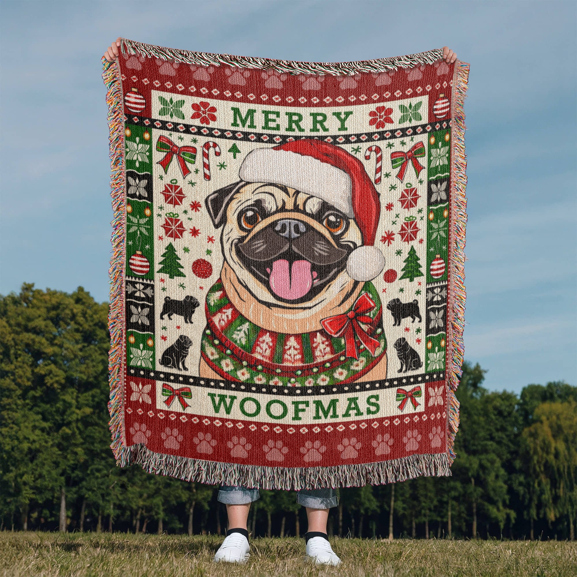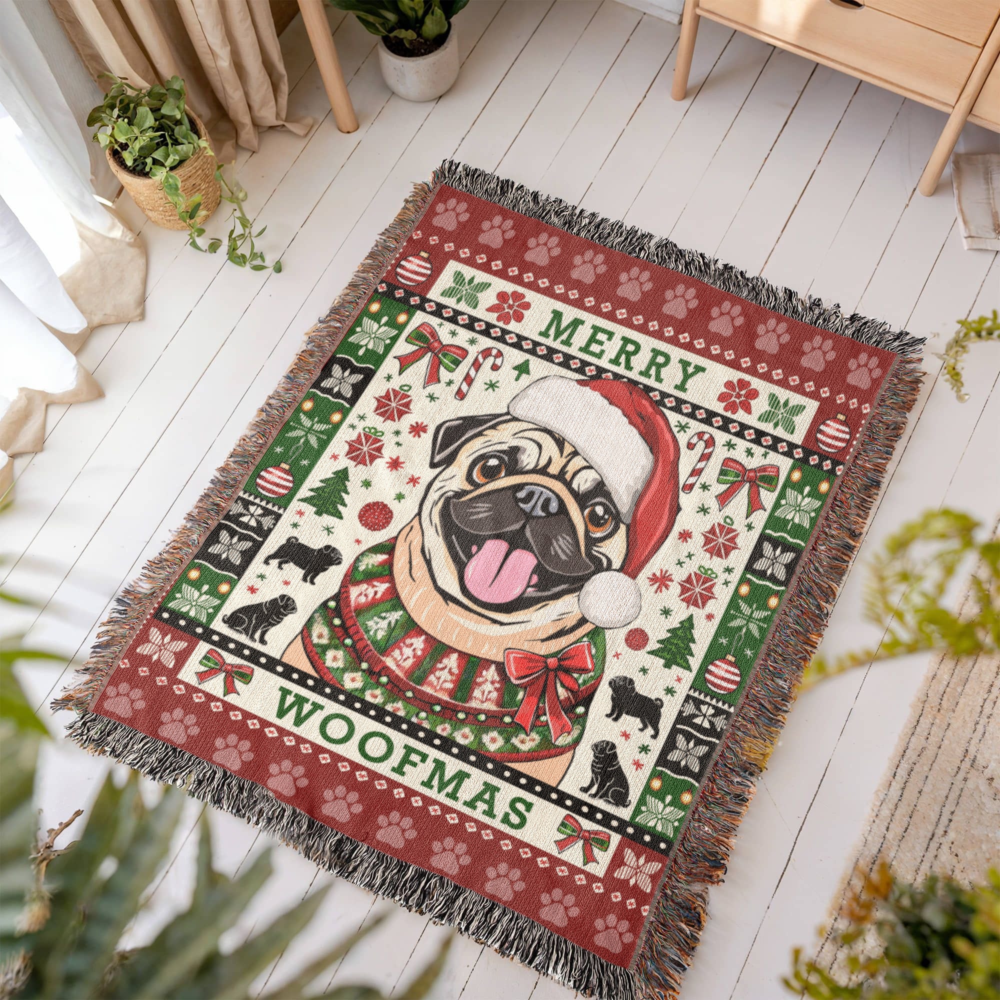Celebrate the season with this Pug Christmas Blanket, a one-of-a-kind keepsake AND it's made in the USA. Perfect for curling up during the holidays and adds a festive touch to the Pug lover's holiday decor. Makes an ideal gift for your favorite Pug lover.